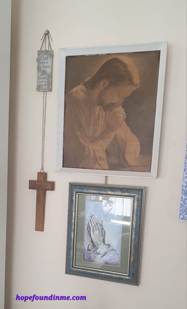 I happened to be gazing at two images I have in my upstairs prayer/quiet/pantry space, as I prepared to join Sunday Eucharist with St Martin’s-in-the-fields via livestream. Whilst gazing, I was practising the Hail Mary, very apt for Mothering Sunday, to see if I could remember it. Saying it brought a new depth and emotion to the image of Christ. And was a very moving experience. I feel incredibly blessed by that.