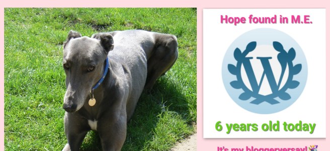 Hi lovely readers! My blog is six years! Why Did I Start Blogging? It's my bloggerversary. Hope found in M.E. is six years old today! I started blogging as a way to help me cope with the loss of my first companion hound. He's featured above. A beautiful greyhound who failed the racing grade and … Continue reading Hope found in ME is Six!